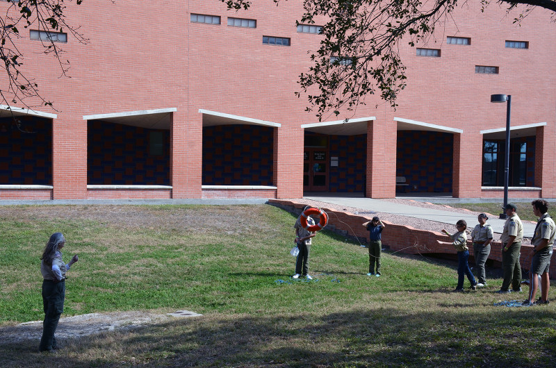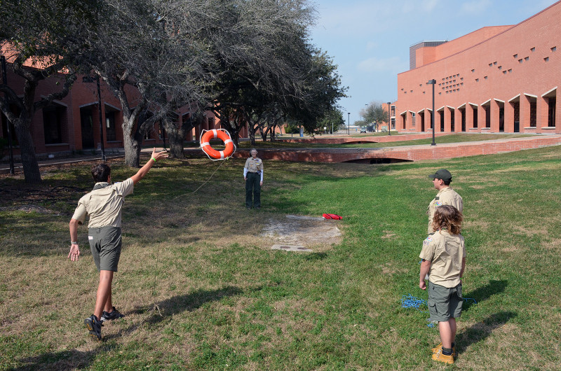 Scout participants practice honing their rescue techniques by tossing a personal floatation device to improve accuracy during an outdoor activity at Merit Badge College.